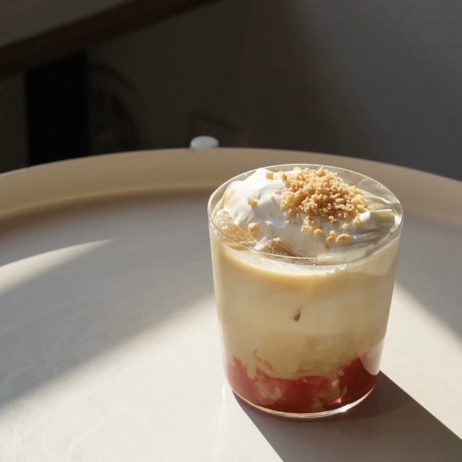 甘酸っぱい苺とホワイトチョコのやさしい甘さが広がり、コーヒーがバランスよく溶け合う贅沢な味わいに仕上がっています。トッピングのキャラメルクランチがザクっと心地よい食感のアクセントに。